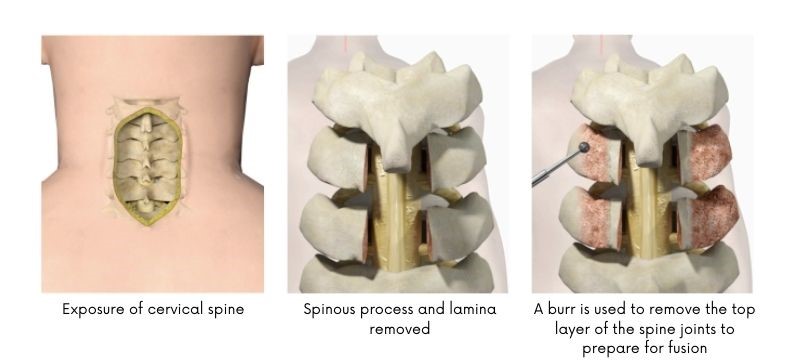 Cervical laminectomy and fusion are performed through an incision on the back of your neck. This procedure involves fully or partially removing bone, including bone spurs, that covers and surrounds the spinal cord and spinal nerves. This is done to enlarge the space for the spinal cord and/or nerves. The goal of the procedure is to relieve pressure on (compression of) the cord or nerves. Your surgeon will then perform a spinal fusion in order to stabilize the spine. This procedure usually includes the placement of stabilization devices such as metal screws and rods to help hold the spinal bones (vertebrae) together. Your surgeon will also place natural or synthetic bone material to assist in the healing process.