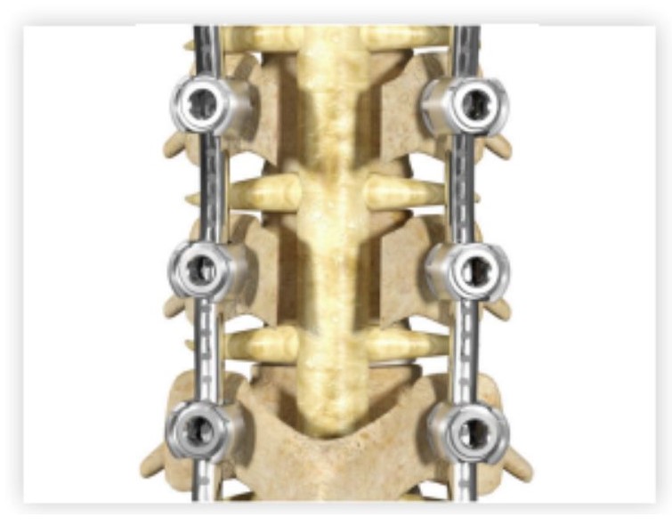 Your surgeon may also choose to use devices such as metal screws and rods to help add stability. A drill is used to make holes in the bones connecting the back of the vertebrae to the vertebral bodies in the front of the spine. These bones are called lateral masses, and the instrumentation placed into them in this procedure are called lateral mass screws. Rods are inserted and locked into the heads of the screws on both sides to connect them.